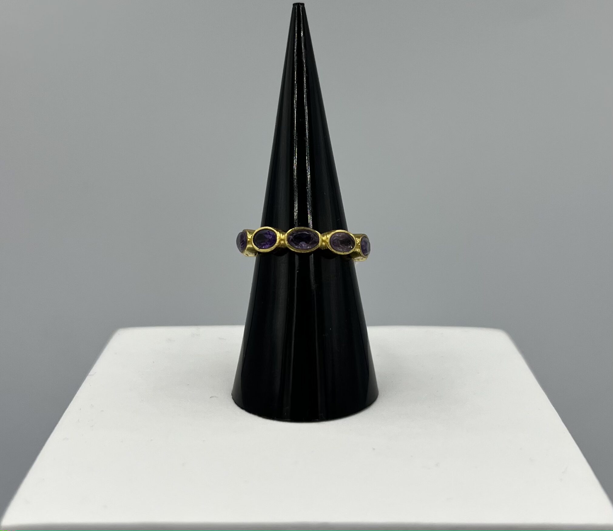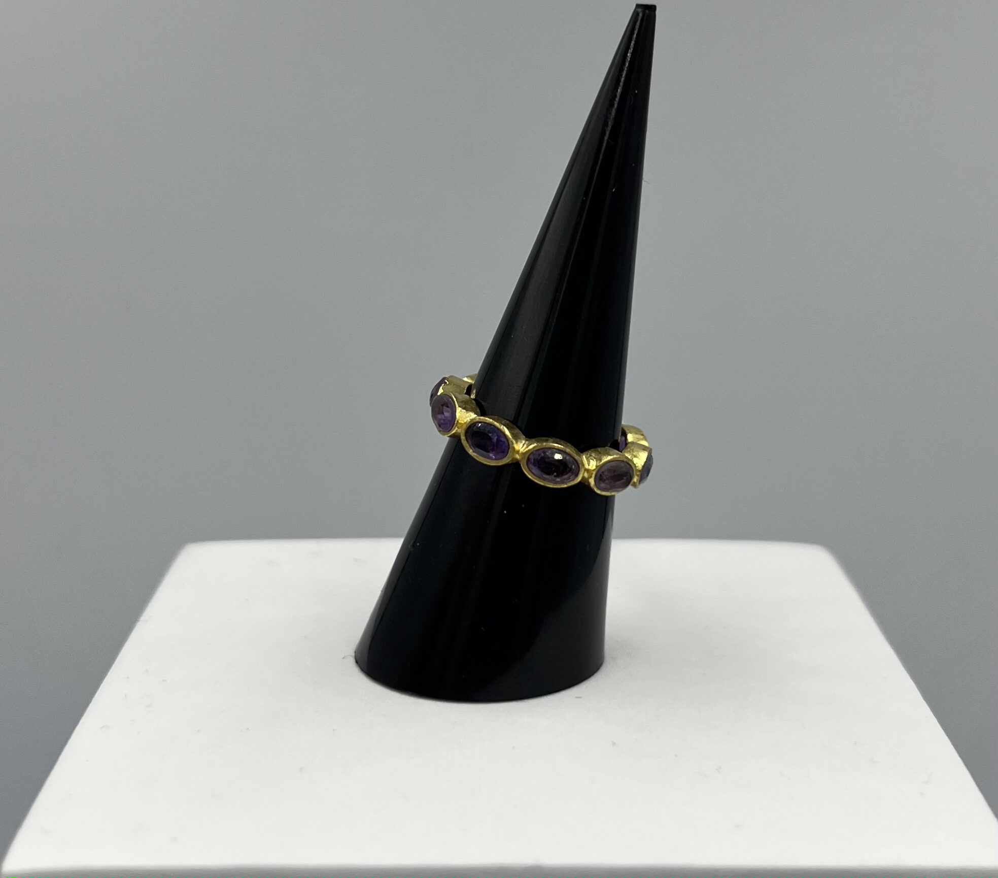 Chic et envoûtante, la bague Minuit Impérial allie l’éclat chaleureux de l’argent 925 doré à la profondeur envoûtante de l’améthyste. Sur un anneau fin, les pierres violettes sont serties en continu, taillées en ovale pour refléter la lumière avec élégance et raffinement.