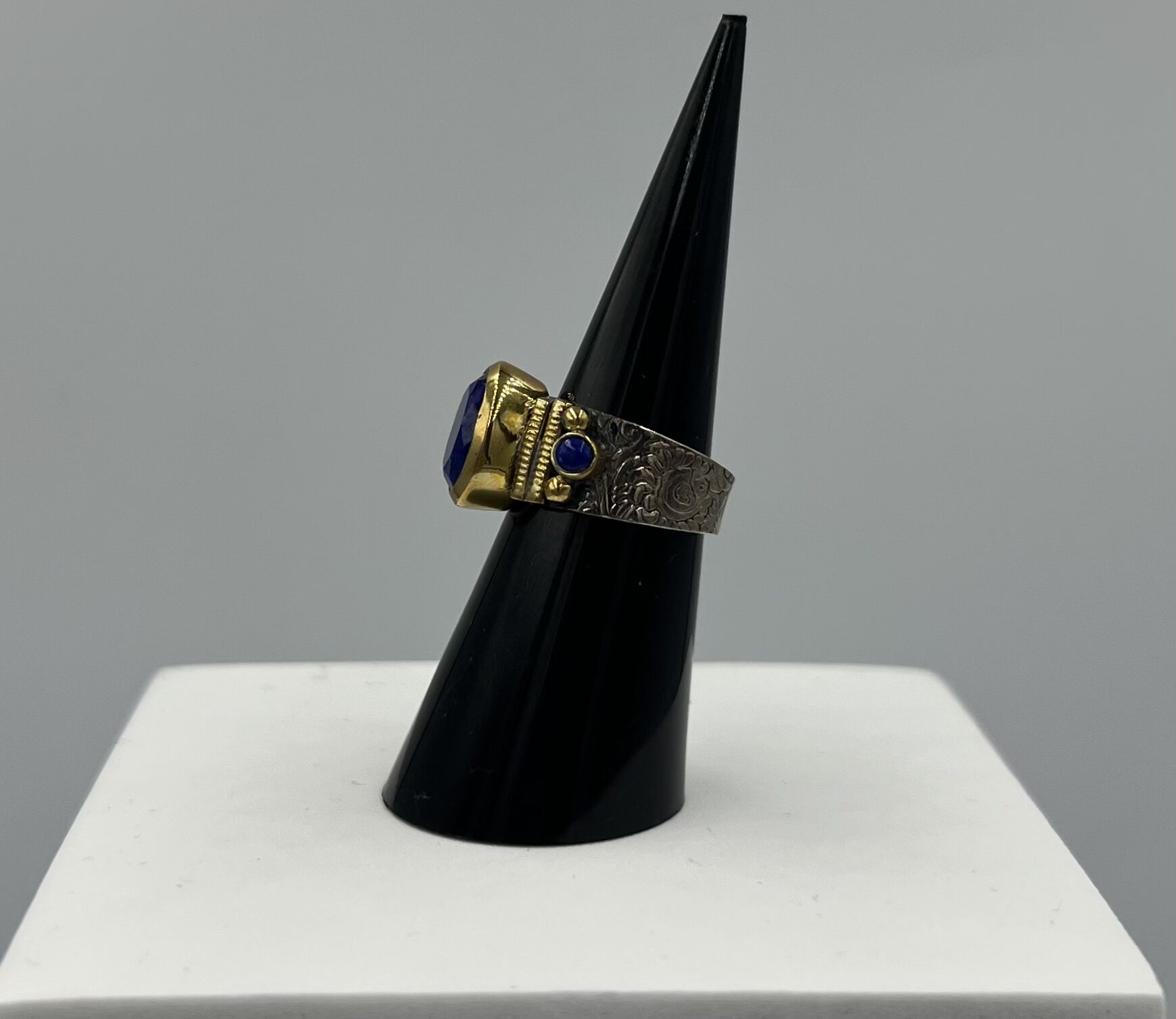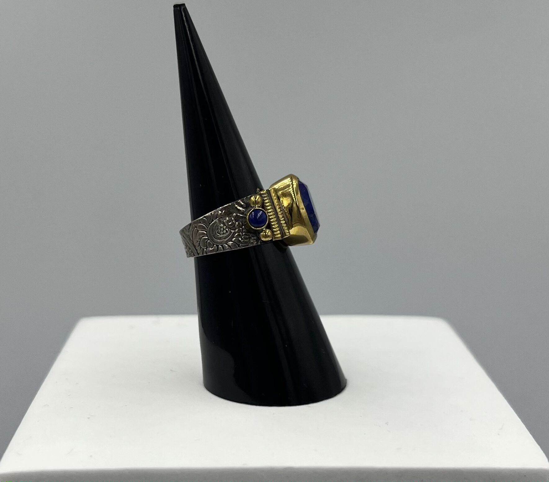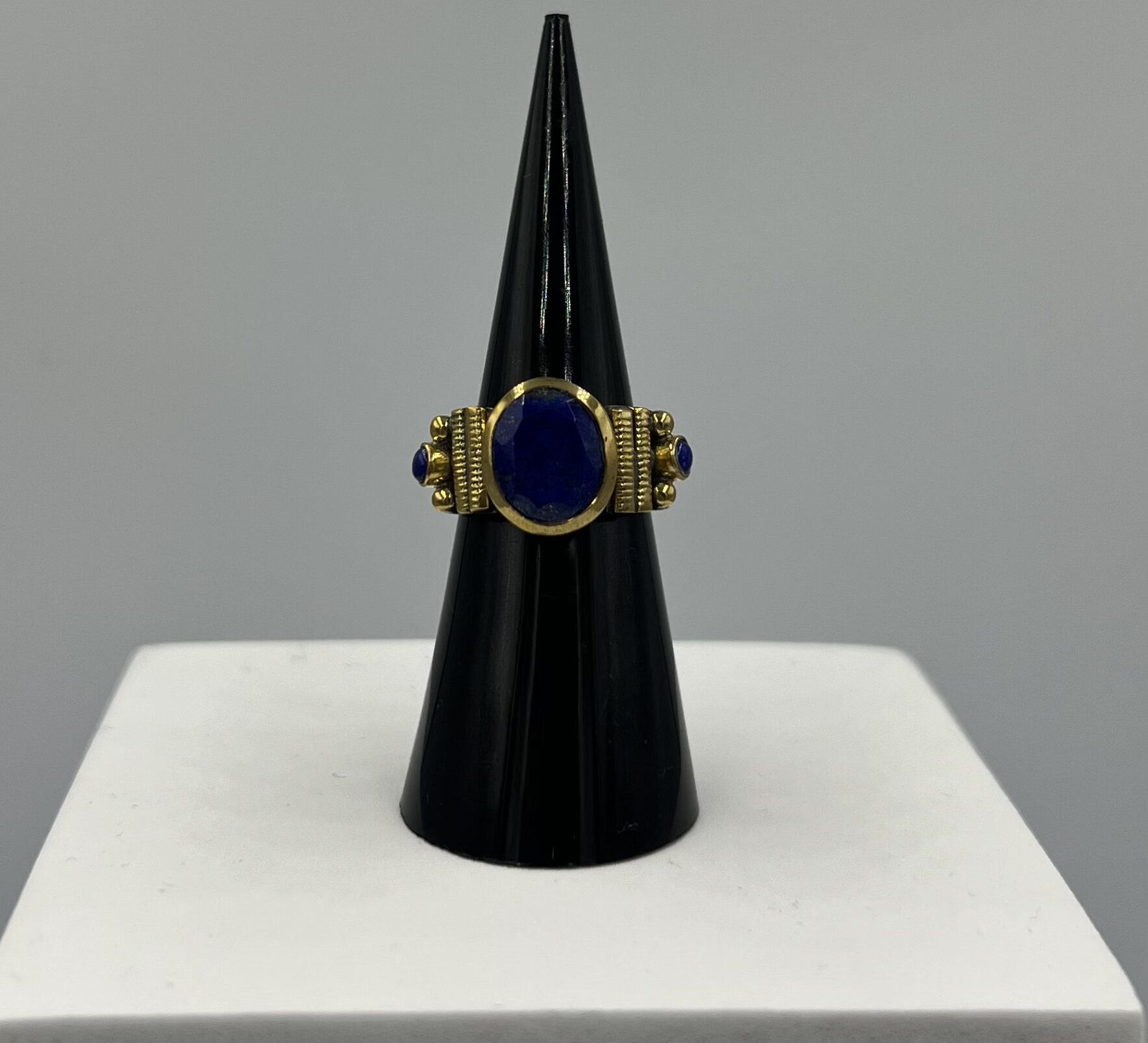 Singulière et vibrante, cette bague mêle subtilement l’argent 925 et le laiton doré pour sublimer une pierre centrale en lapis-lazuli, à la couleur bleu profond parsemée de reflets dorés naturels. Ce contraste de matières et de tons confère au bijou une personnalité forte, entre chaleur dorée et fraîcheur argentée.