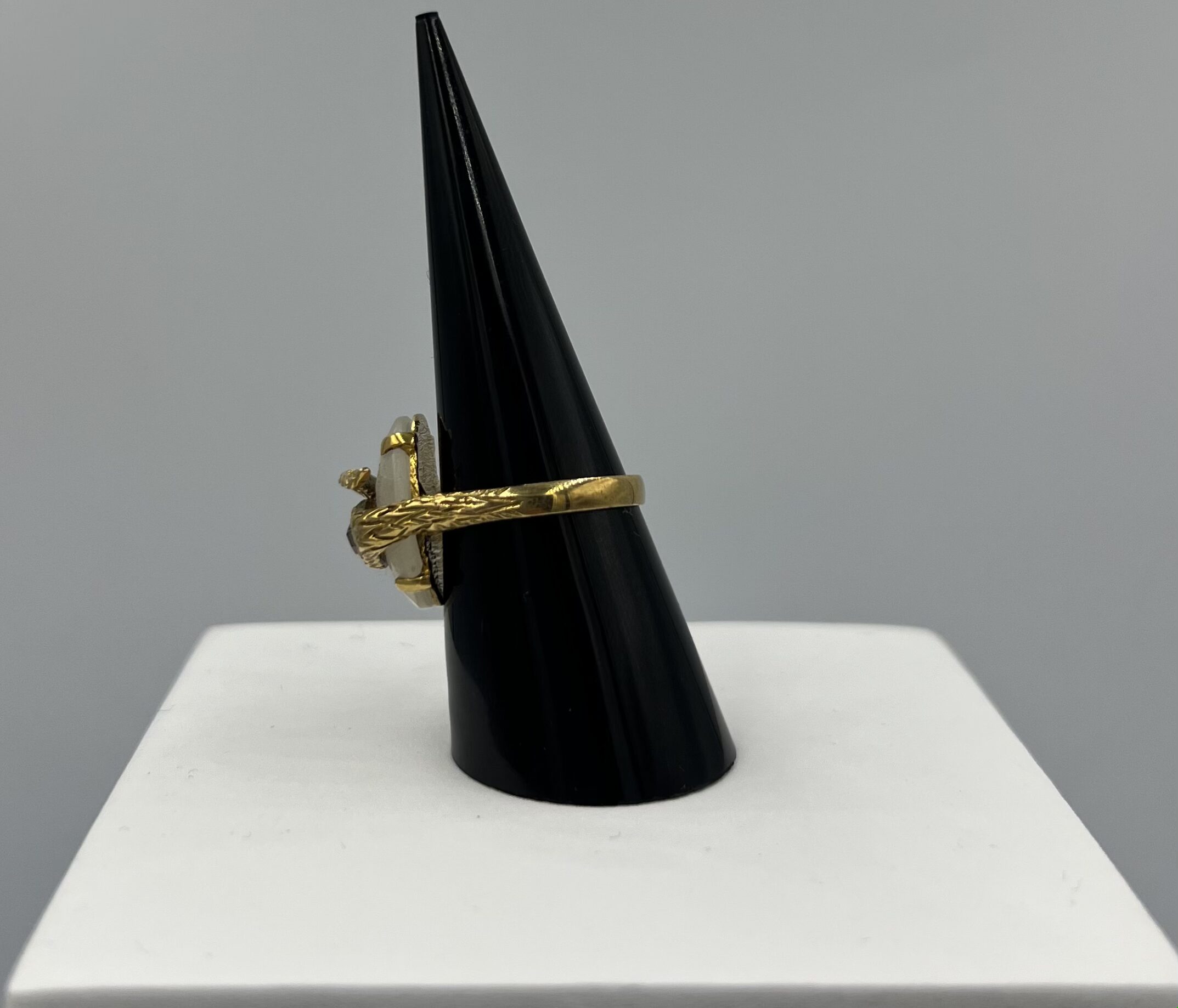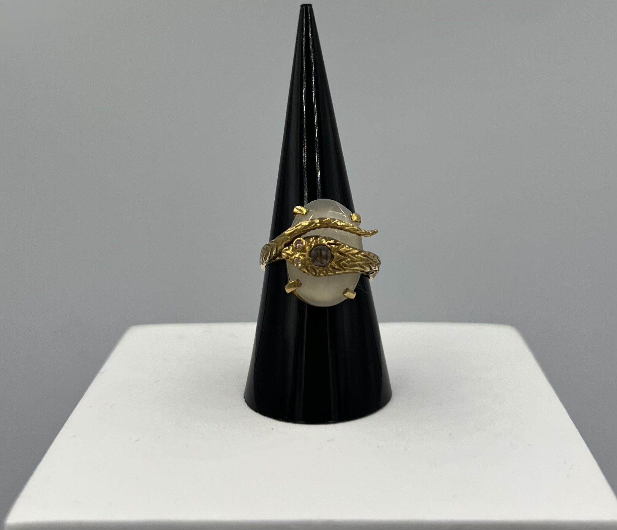 Sa monture finement travaillée, au motif doré rappelant un œil protecteur, confère à cette pièce une aura mystique et raffinée. Alliance parfaite entre symbolisme et joaillerie, cette création unique est destinée à celles et ceux qui aiment porter un bijou porteur de sens et d’histoire.