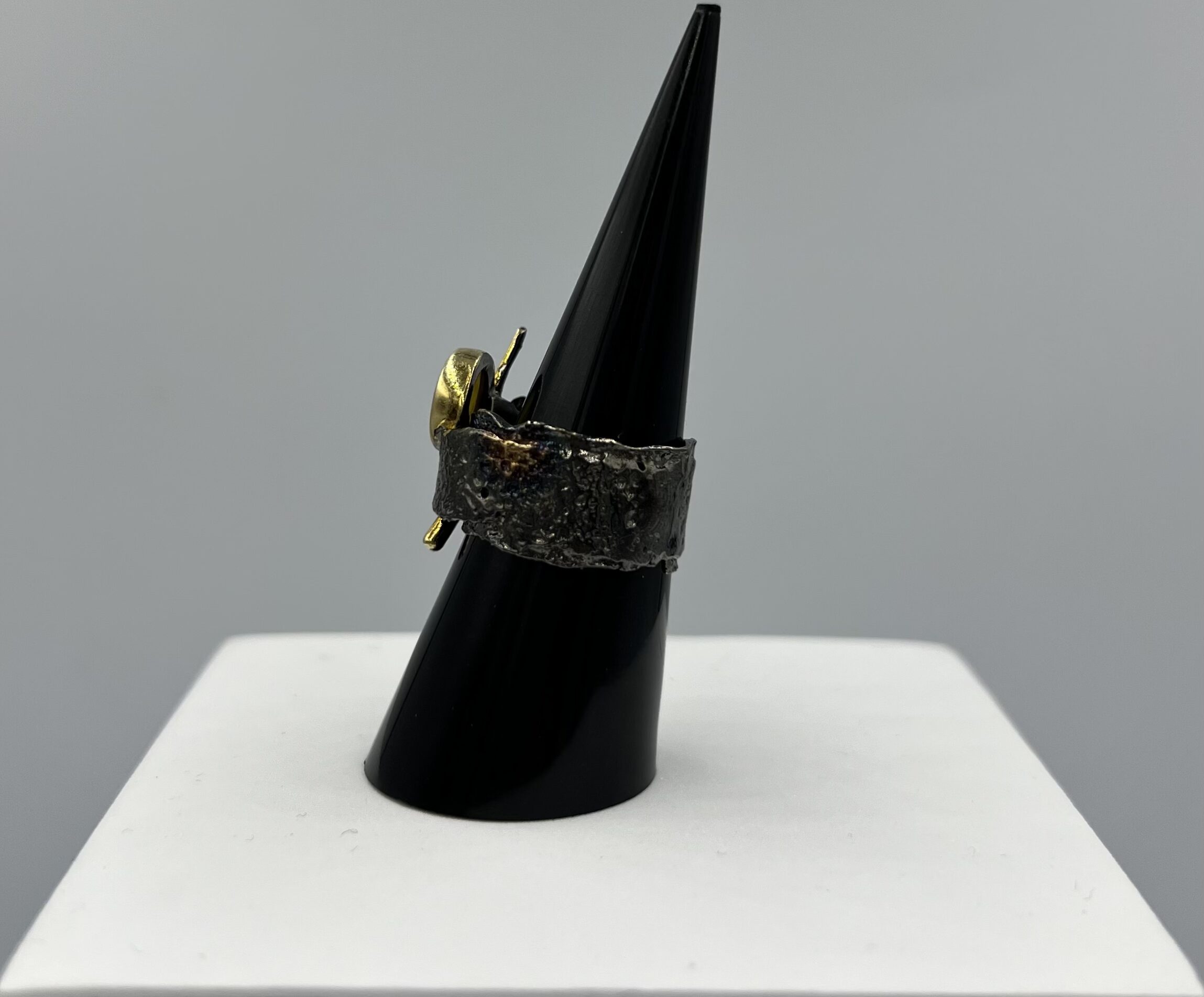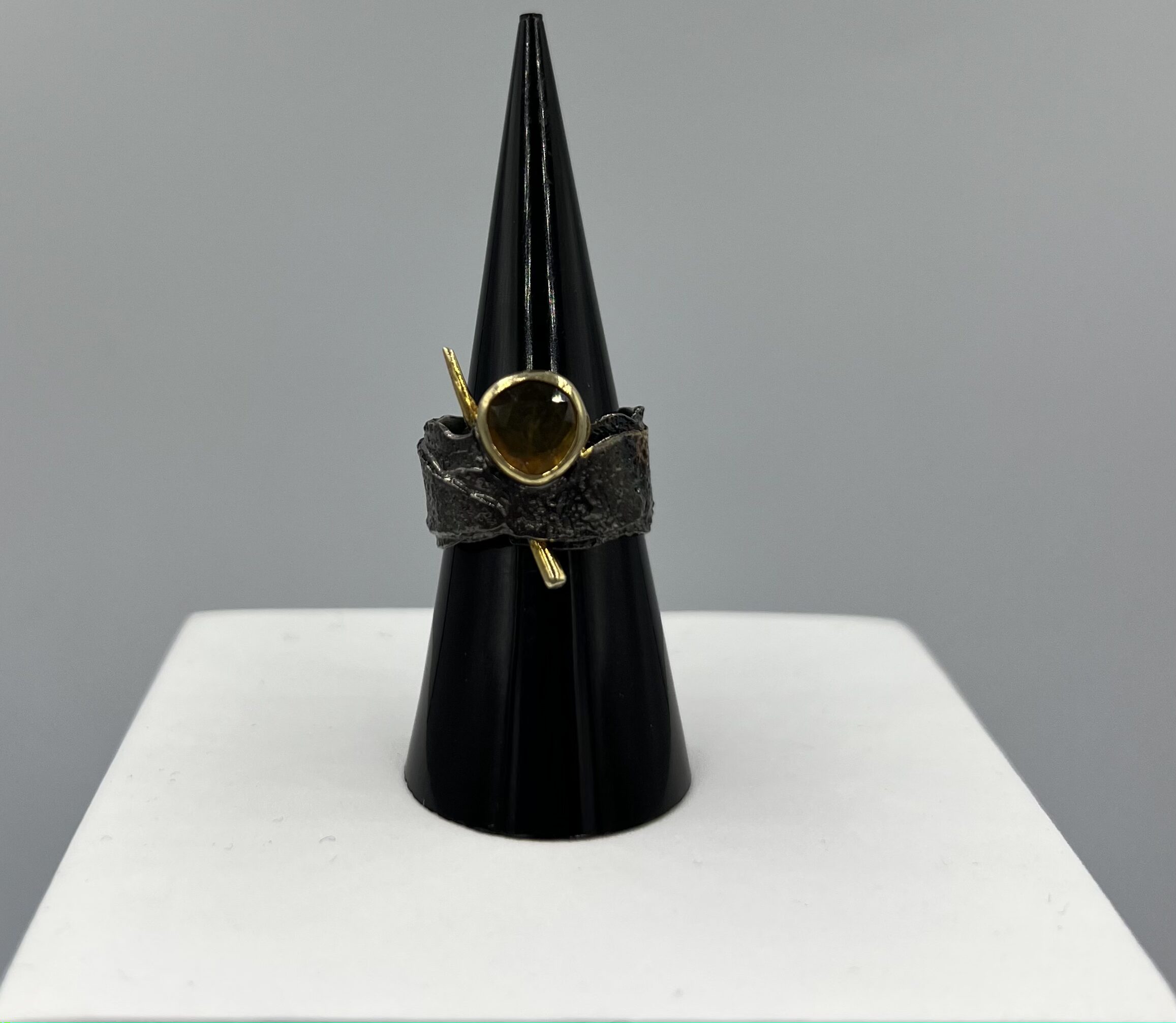 Cette bague au caractère affirmé marie la noblesse de l’argent 925 travaillé dans un style brut et texturé à l’éclat envoûtant d’un quartz fumé, serti dans un entourage doré. Sa monture large, presque sculpturale, évoque la force de la nature et le raffinement de l’artisanat joaillier.