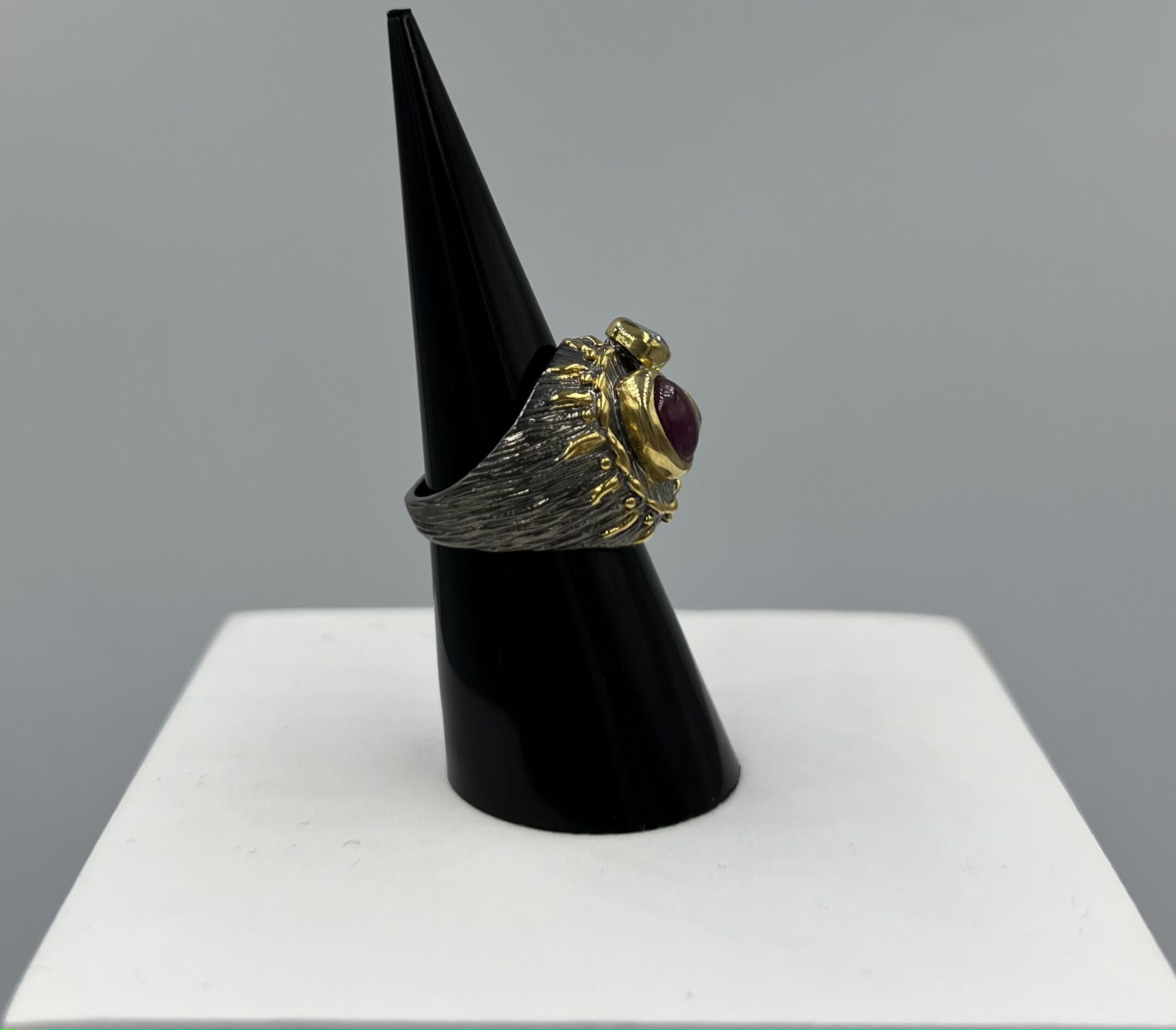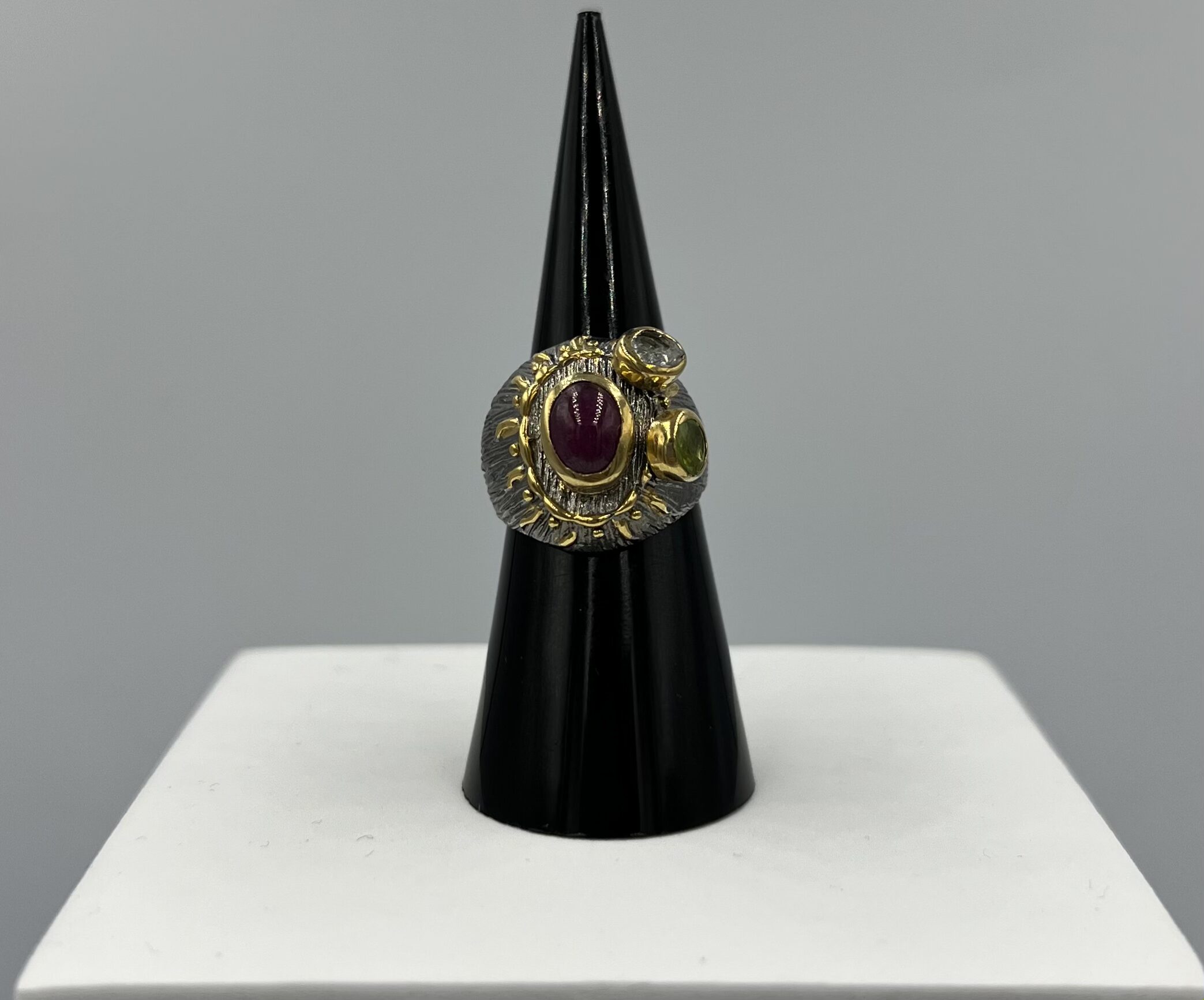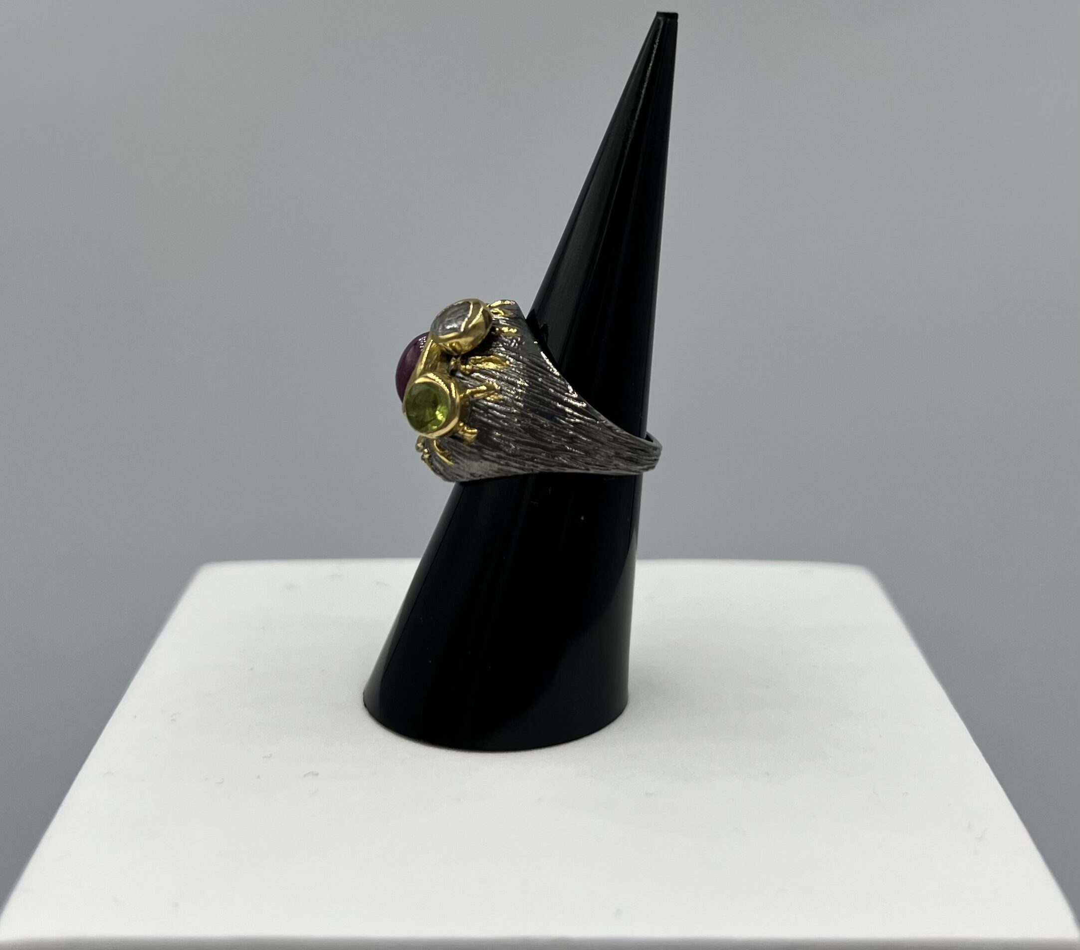 Alliance éclatante de couleurs et de matières, cette bague en argent 925 marie le feu d’un rubis profond, la fraîcheur d’un péridot lumineux et la pureté cristalline d’un quartz blanc. Montées sur une base texturée et ornée de détails dorés, ces pierres semblent dialoguer entre elles, formant une constellation de lumière et de symboles.