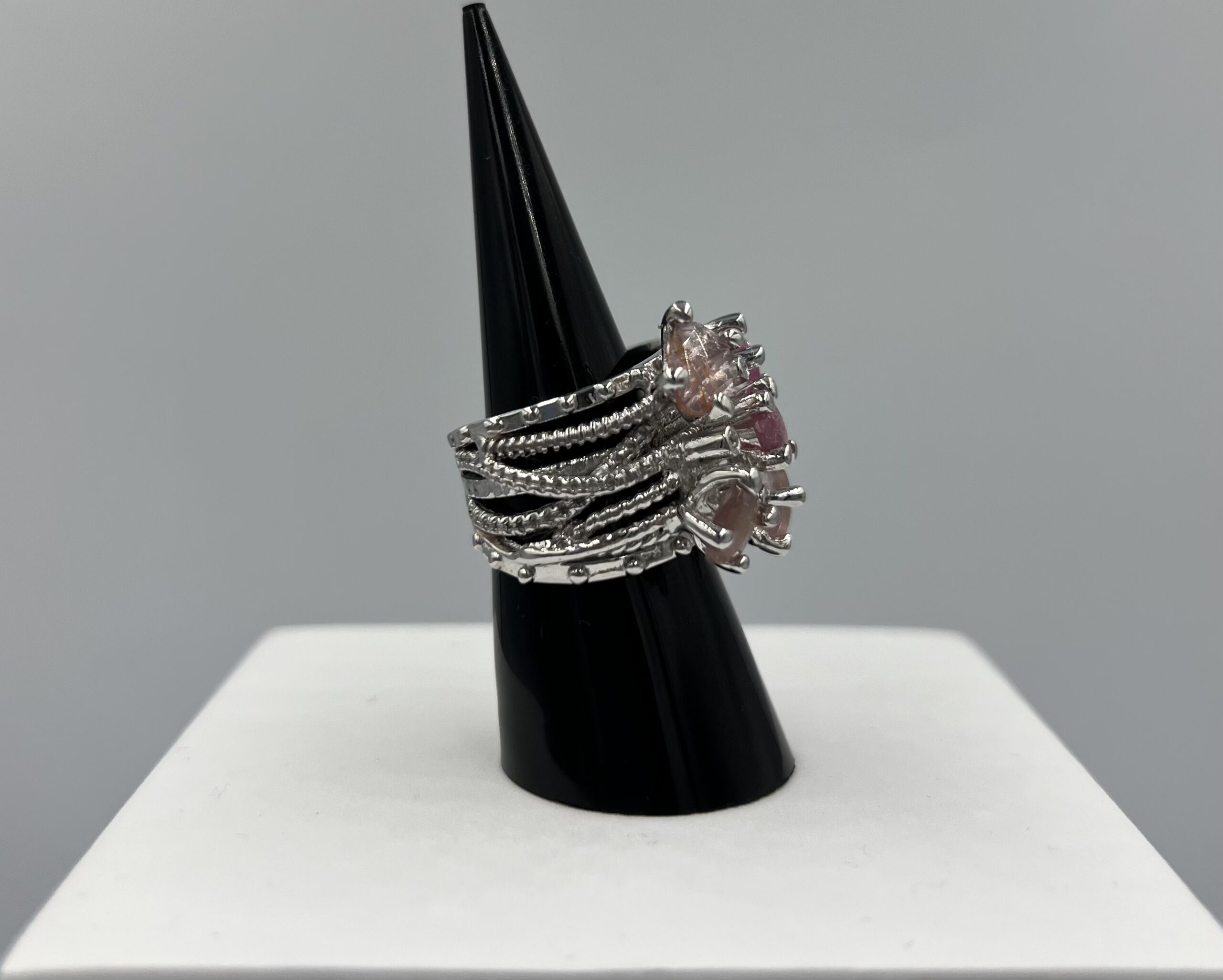 Féminine et envoûtante, cette bague en argent 925 rhodié se pare d’un camaïeu somptueux de saphirs roses, offrant un jeu de nuances éclatant. Sertis avec précision, ces pierres précieuses forment une composition raffinée et lumineuse, rappelant la délicatesse des pétales de fleurs en plein épanouissement.