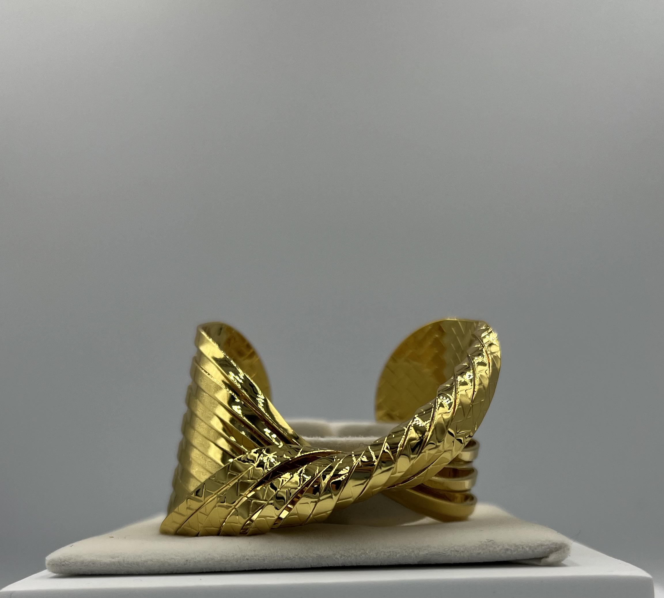 Cette manchette en acier inoxydable doré a été pensée autour de cette idée. Ses lignes torsadées et galbées s’enroulent autour du poignet dans un mouvement continu, créant un jeu de courbes élégantes et de reflets lumineux. Le travail du métal met en valeur la profondeur des formes et souligne chaque contour avec finesse.