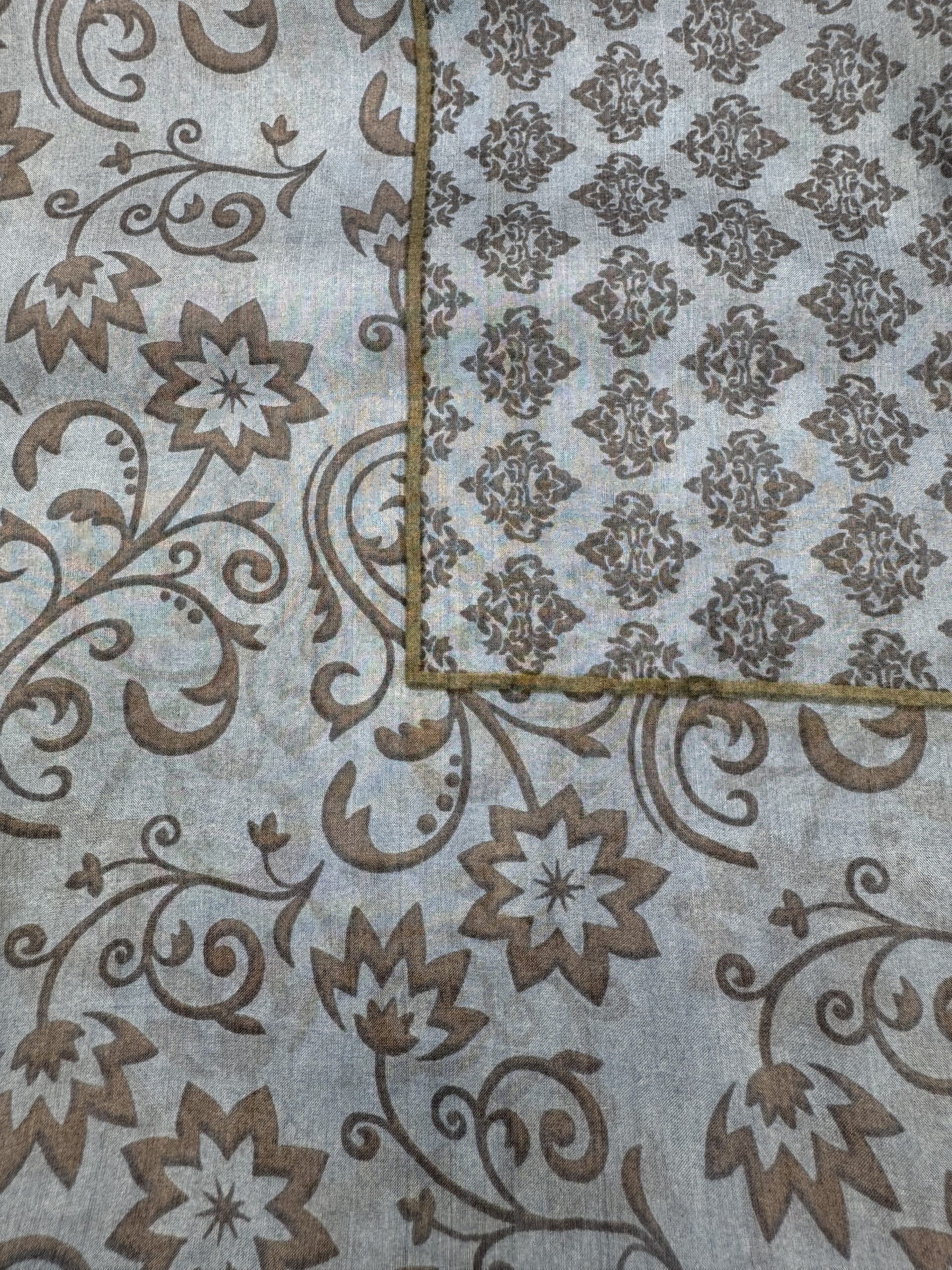 Un châle en soie au raffinement discret, sublimé par un motif d’arabesques délicates et de rosaces stylisées. Sur un fond clair subtilement chiné, les dessins se déclinent en tons sépia, brun chaud et beige doux, créant une harmonie classique et apaisante. Une fine bordure contrastée vient structurer l’ensemble et souligne la finition soignée de la pièce.