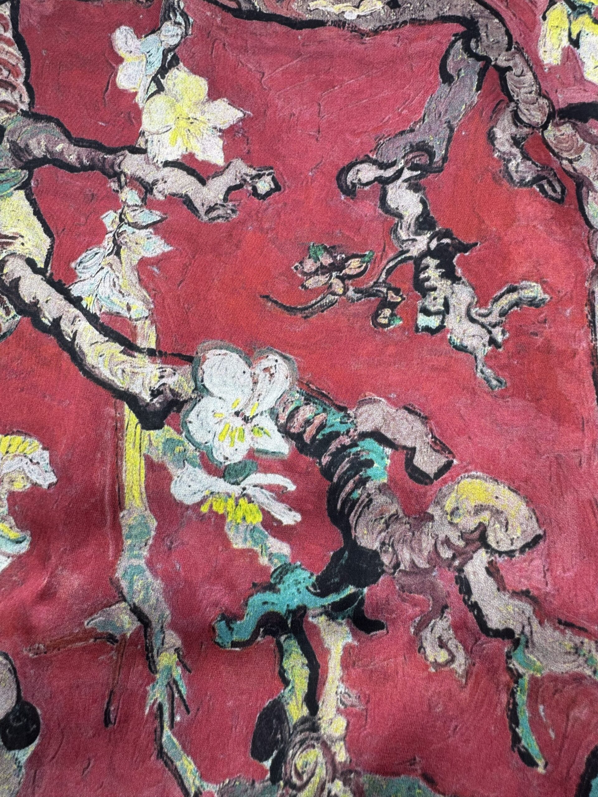 Un châle en soie à l’allure artistique et délicate, inspiré d’une peinture expressive. Son fond rose ancien profond, subtilement patiné, accueille un motif de branches sinueuses et de fleurs écloses aux tons ivoire, jaune doux et touches de vert nuancé. La soie capte la lumière avec finesse et révèle toute la richesse de ce décor floral, entre romantisme et sophistication.