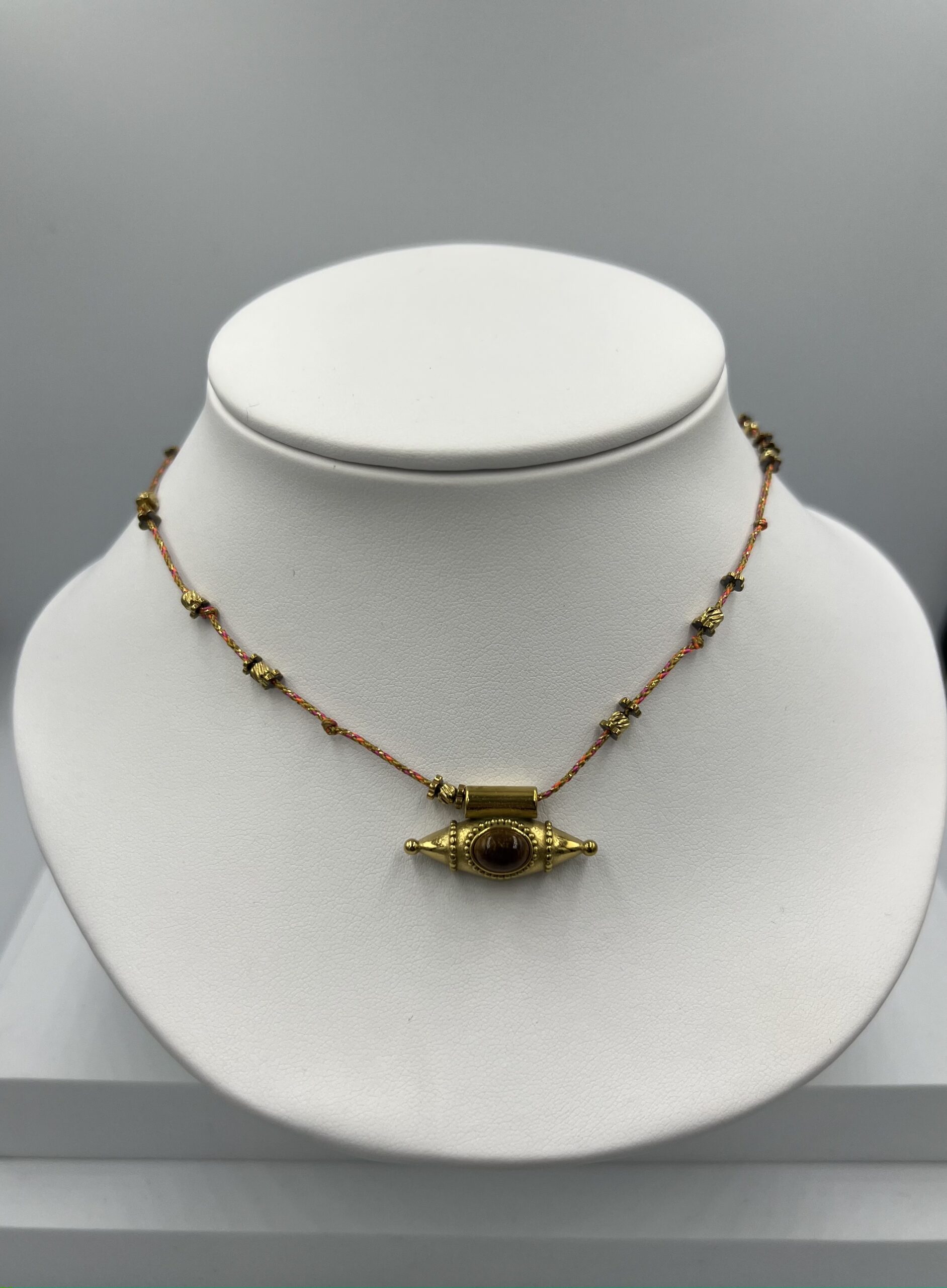 Ce collier en acier inoxydable doré se distingue par son pendentif en forme d’œil, serti d’une pierre d’œil de tigre. Les reflets dorés et bruns de la pierre créent un jeu de lumière fascinant, tout en symbolisant force, protection et confiance intérieure. Le design doré souligne la puissance mystique de l’œil, offrant un bijou aussi moderne que spirituel. Robuste et résistant, il est conçu pour durer et accompagner chaque instant.