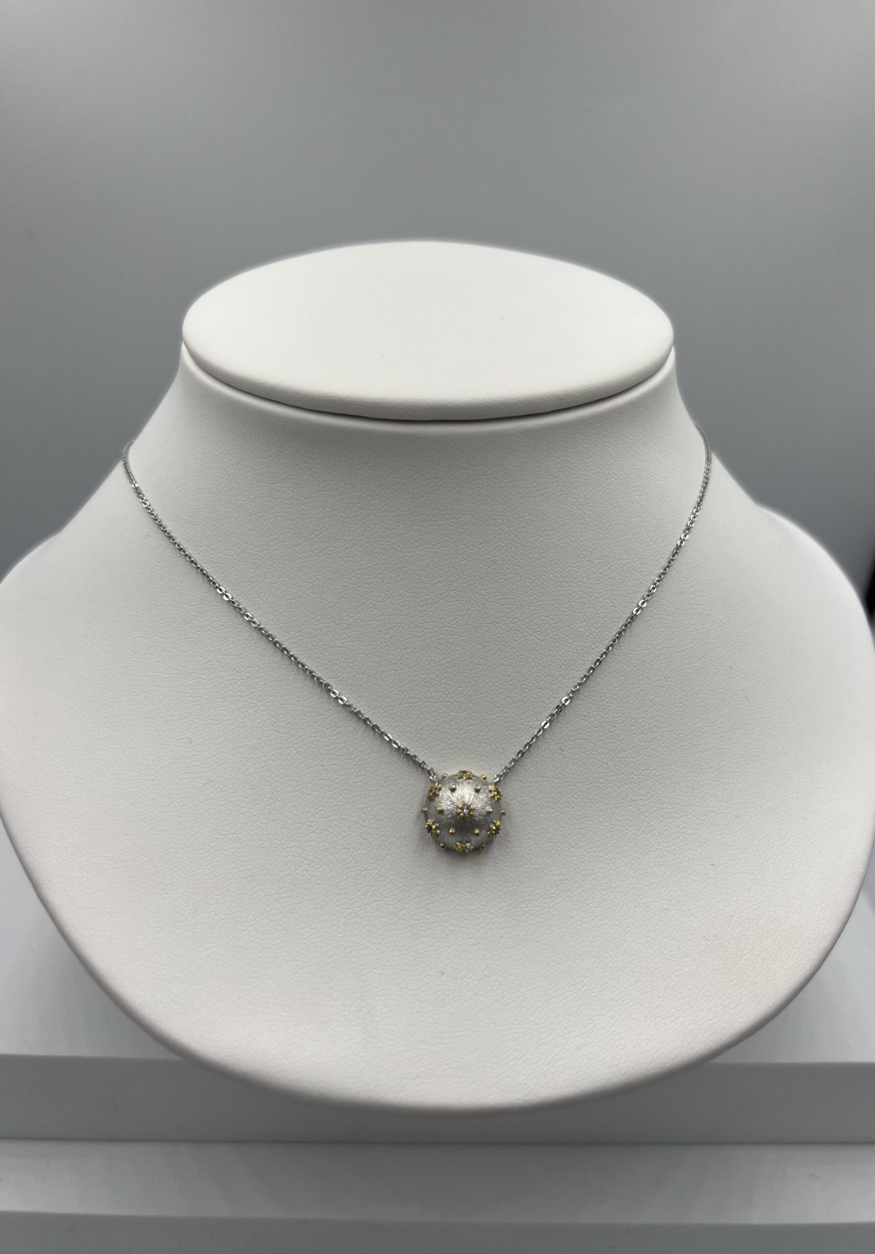 Ce collier en argent 925 se distingue par un pendentif rond orné de délicats détails dorés, formant une texture organique inspirée des motifs naturels. Le contraste entre l’argent éclatant et les touches chaudes du doré crée une pièce à la fois subtile et singulière. Son design intemporel et raffiné en fait un bijou idéal pour sublimer le quotidien comme les occasions spéciales.