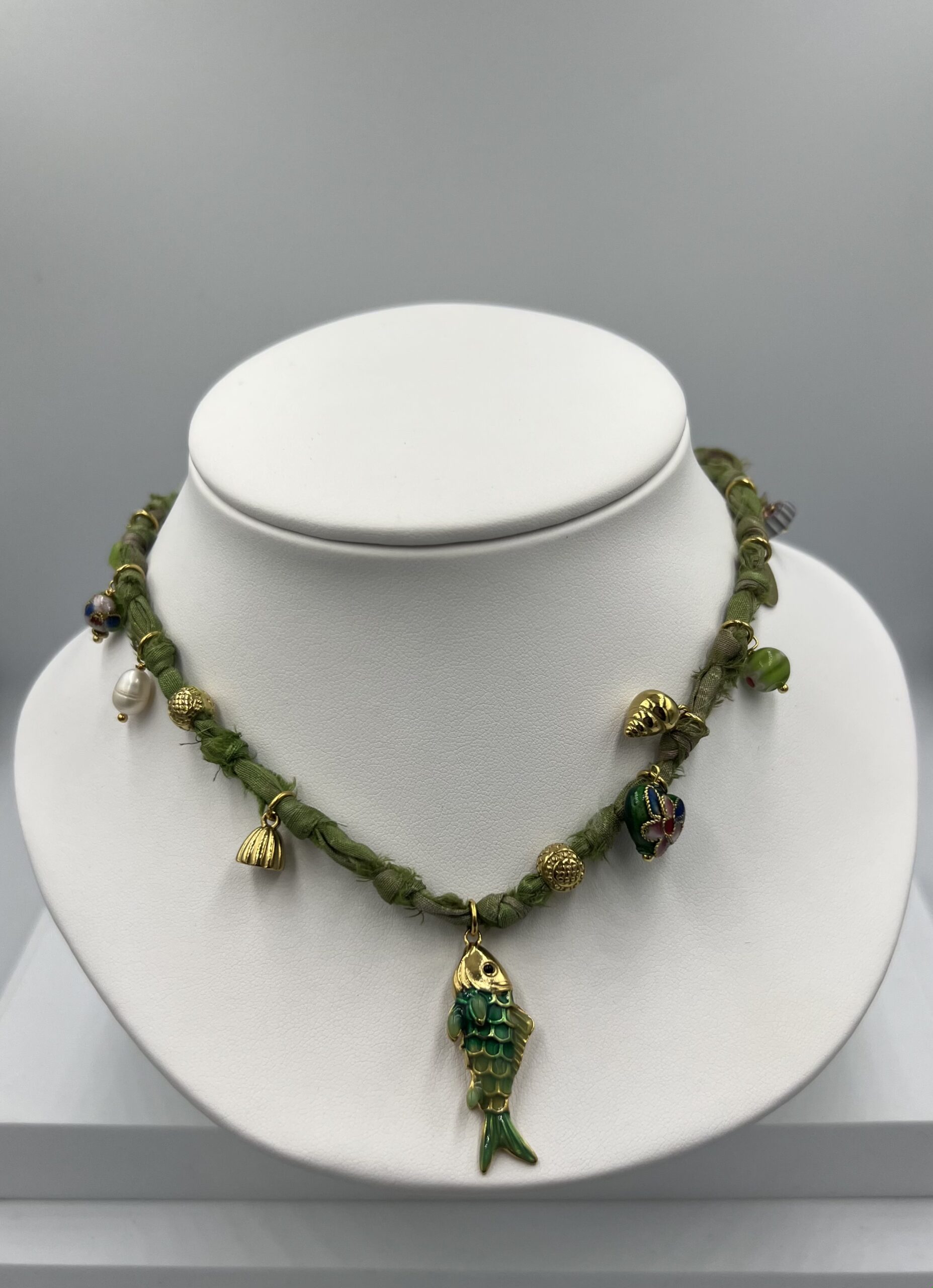 Ce collier unique associe la douceur du tissu à la solidité de l’acier inoxydable, créant un bijou original et durable. Tout au long de la chaîne, de petits pendentifs inspirés de la nature – comme un délicat poisson bleu et d’autres symboles organiques – viennent apporter une touche ludique et poétique. Léger, confortable et résistant, ce collier est conçu pour être porté au quotidien, tout en reflétant un esprit libre et naturel.