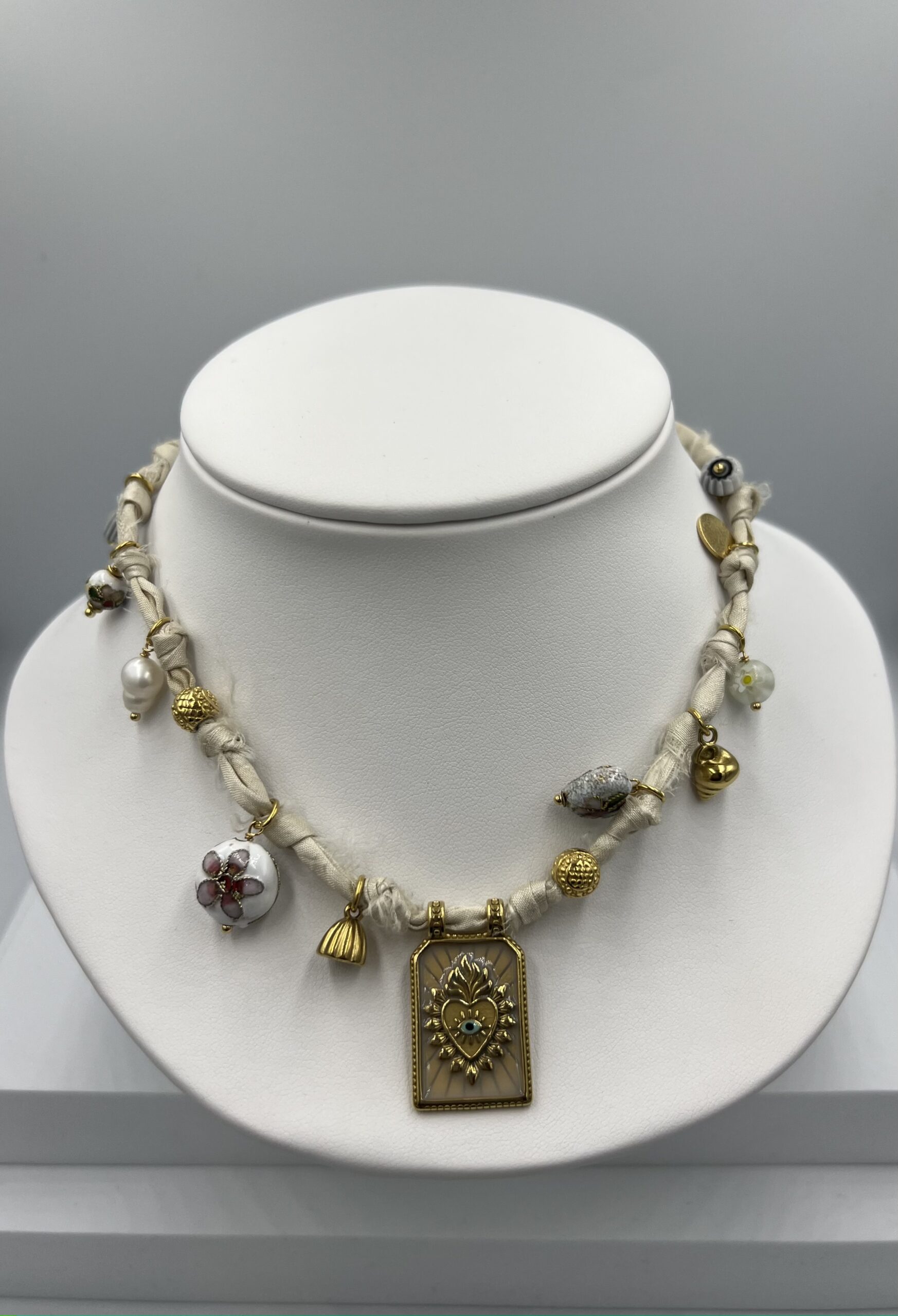 Ce collier combine la douceur d’un tissu blanc raffiné et la solidité de l’acier inoxydable. Tout au long de la chaîne, de petits pendentifs délicats viennent rythmer le bijou, offrant un éclat subtil et raffiné. Son design à la fois original et intemporel en fait un accessoire idéal pour sublimer une tenue légère ou apporter une touche singulière au quotidien.
